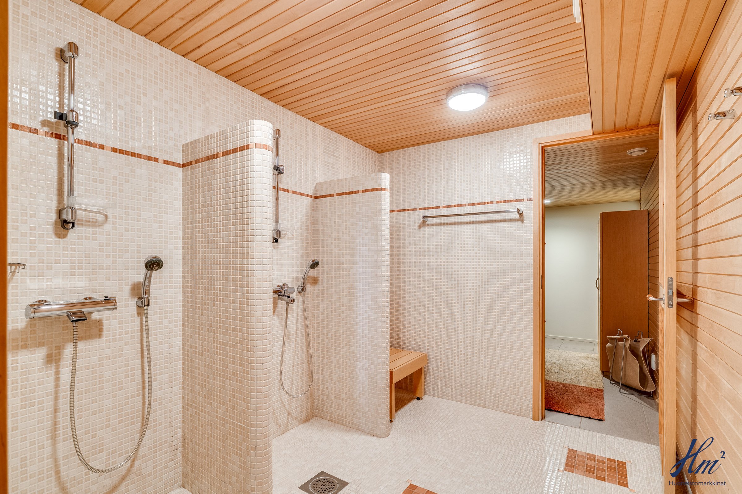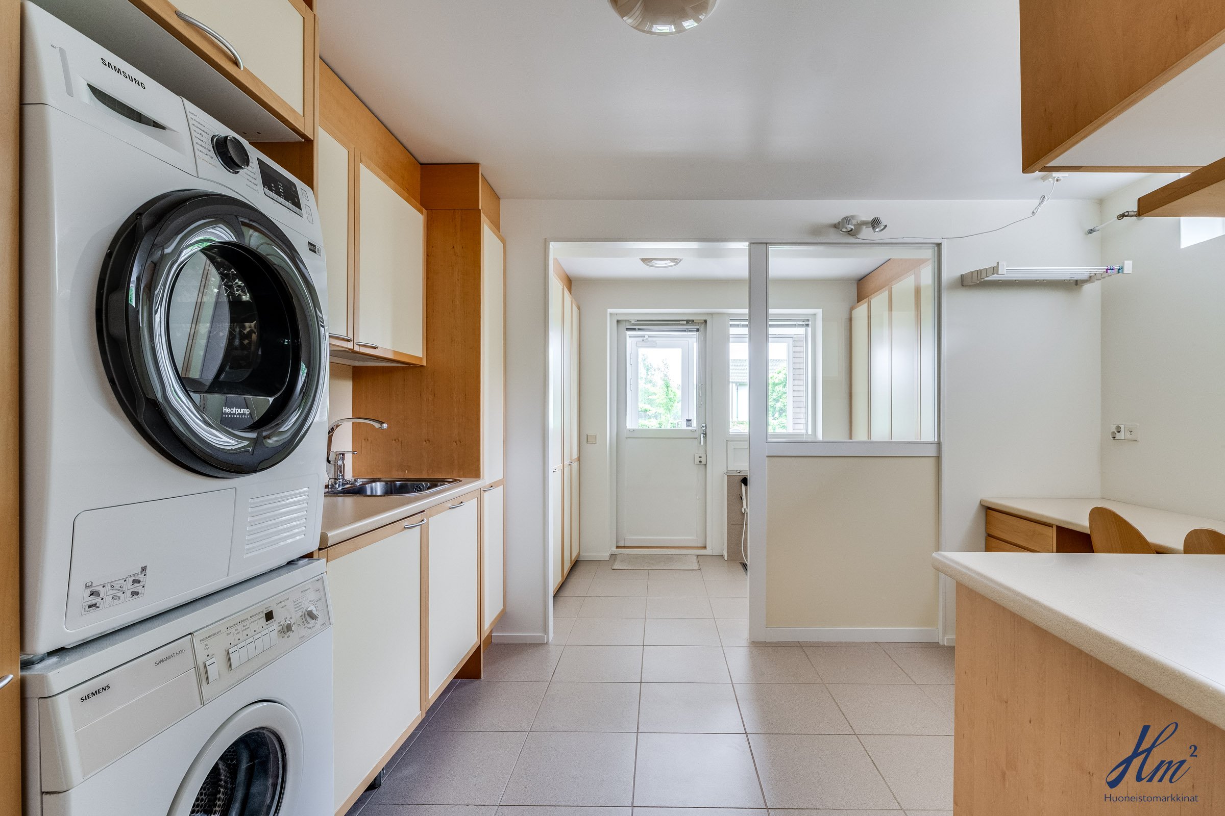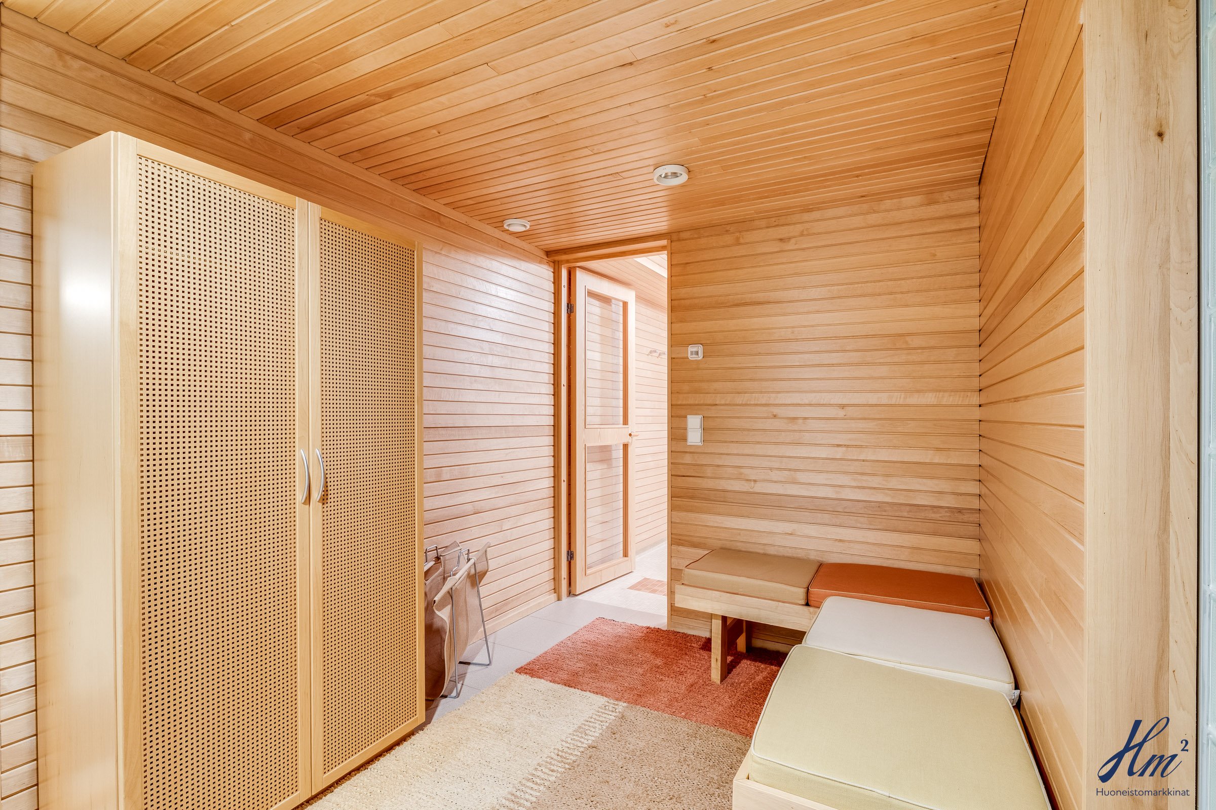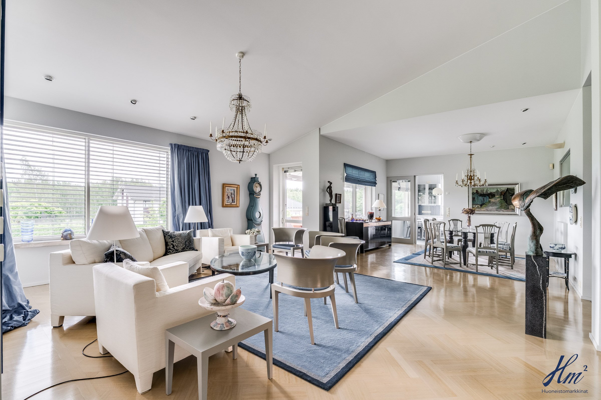 Pääasialliset asuintilat levittäytyvät käytännöllisesti yhteen tasoon. Yläkertaan sijoittuvat eteishalli, 2 erillistä huonetta, tilava olohuone / ruokailutila, keittiö, vaatehuone, erillinen wc-tila sekä toisen huoneen yhteydessä oleva oma pesuhuone / wc-tila. Olohuoneesta ja keittiöstä kuljetaan parvekkeelle, josta aukeaa esteettömät näkymät etelän suuntaan. Alakerrasta löytyvät taas iso kodinhoitohuone, yksi huone tulisijalla, erittäin tilavat vaatehuone ja varastotilat sekä kahden auton lämmin talli.