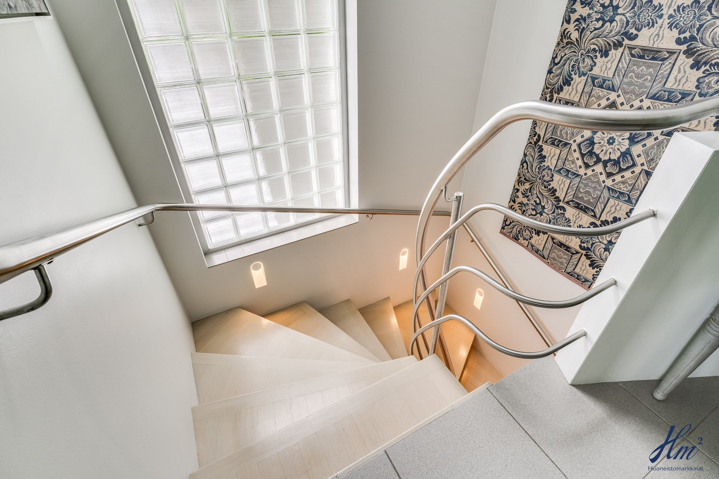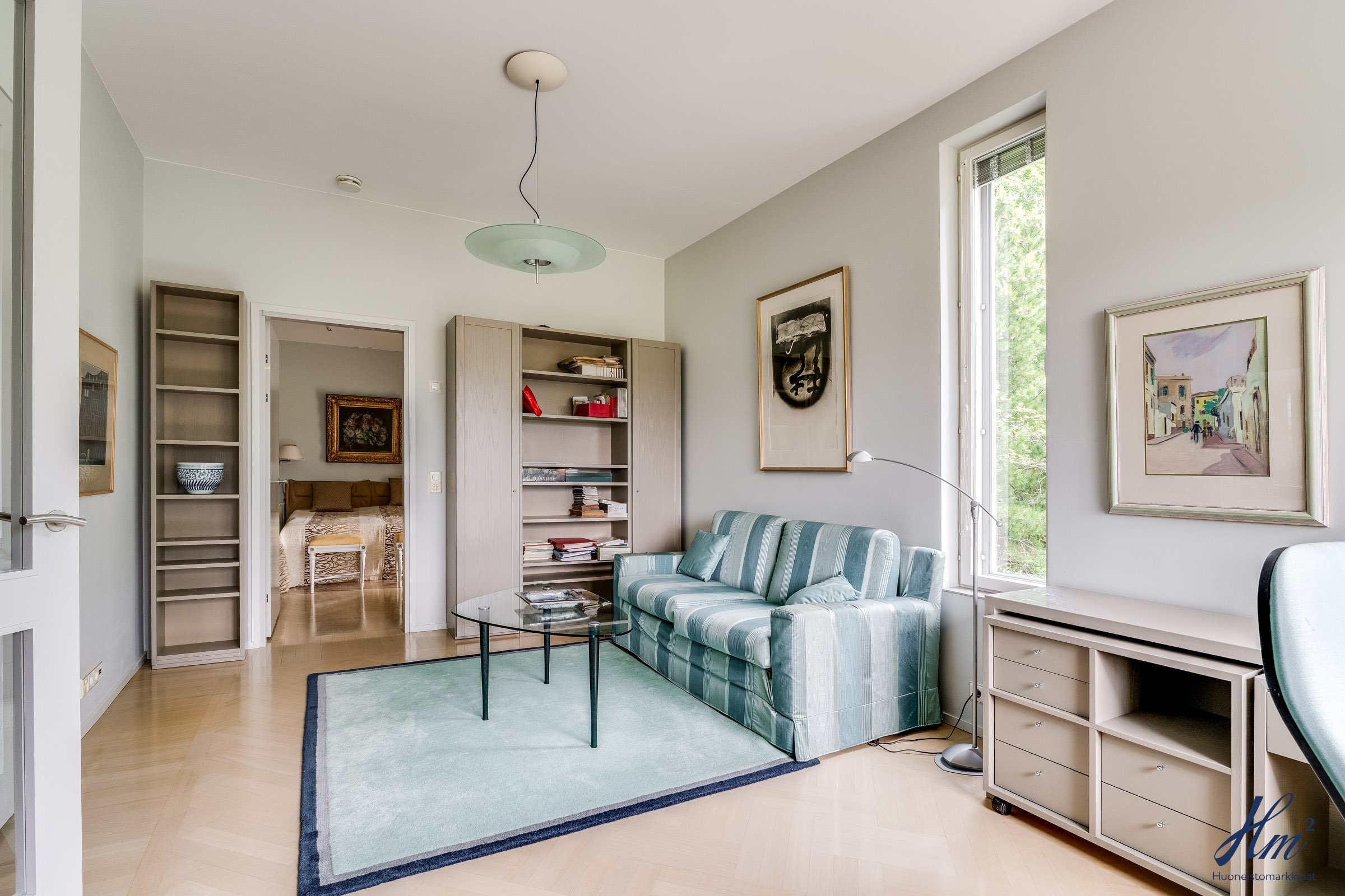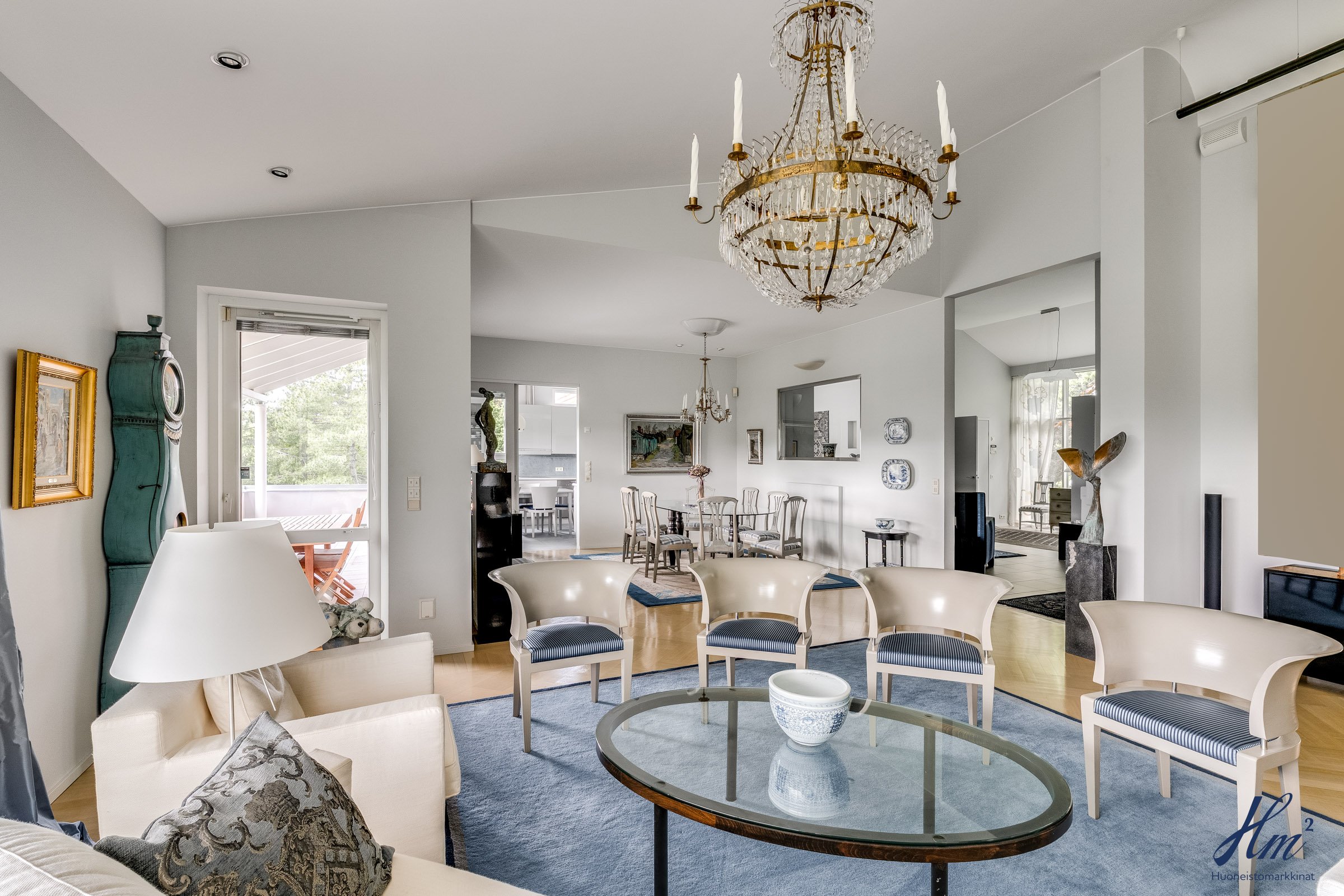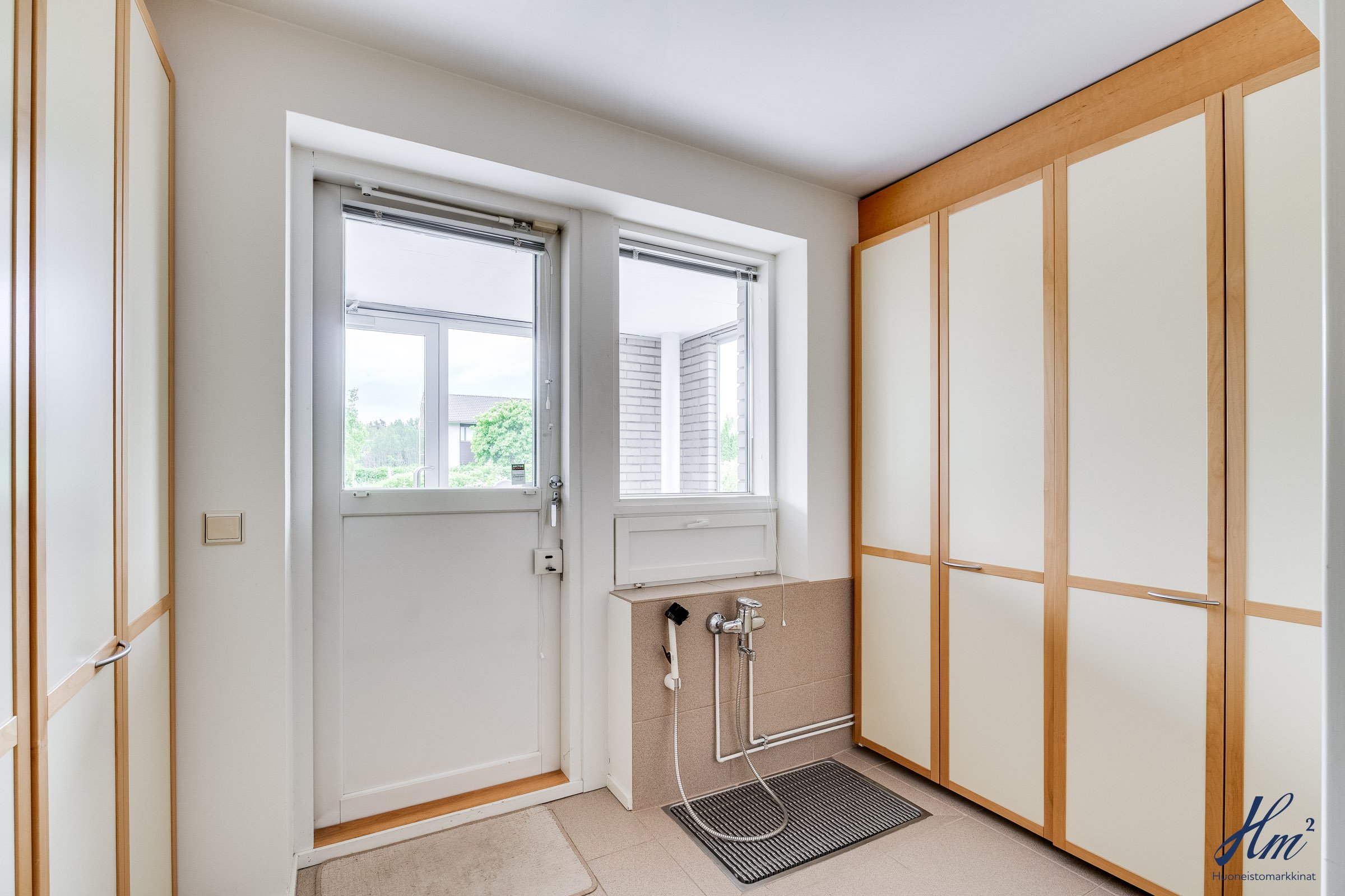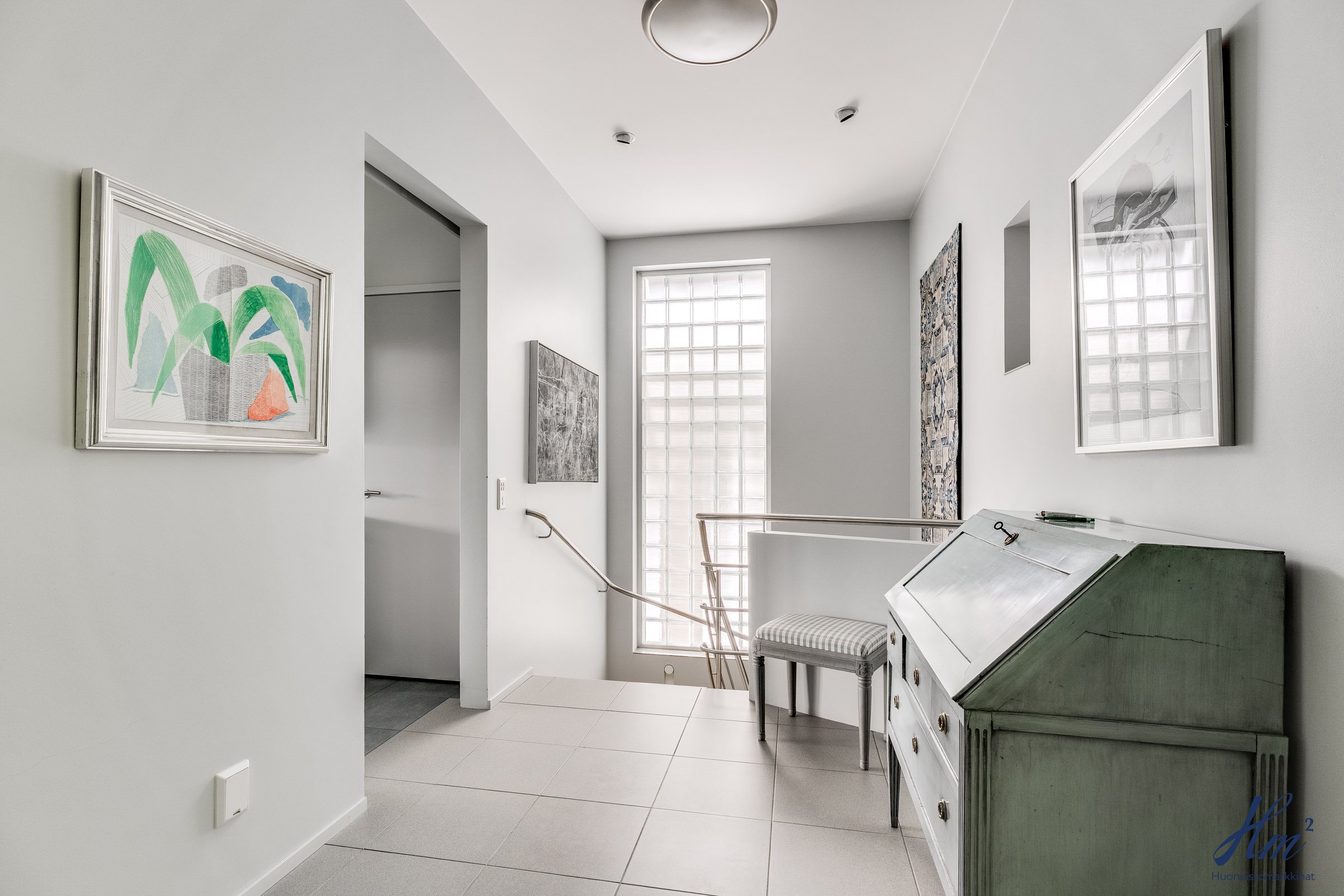 Pääasialliset asuintilat levittäytyvät käytännöllisesti yhteen tasoon. Yläkertaan sijoittuvat eteishalli, 2 erillistä huonetta, tilava olohuone / ruokailutila, keittiö, vaatehuone, erillinen wc-tila sekä toisen huoneen yhteydessä oleva oma pesuhuone / wc-tila. Olohuoneesta ja keittiöstä kuljetaan parvekkeelle, josta aukeaa esteettömät näkymät etelän suuntaan. Alakerrasta löytyvät taas iso kodinhoitohuone, yksi huone tulisijalla, erittäin tilavat vaatehuone ja varastotilat sekä kahden auton lämmin talli.